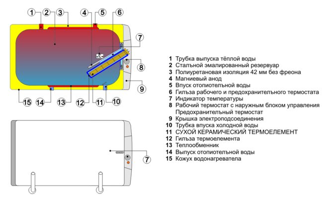 - Обладает внешним терморегулятором, который позволяет легко задать температуру нагрева воды.