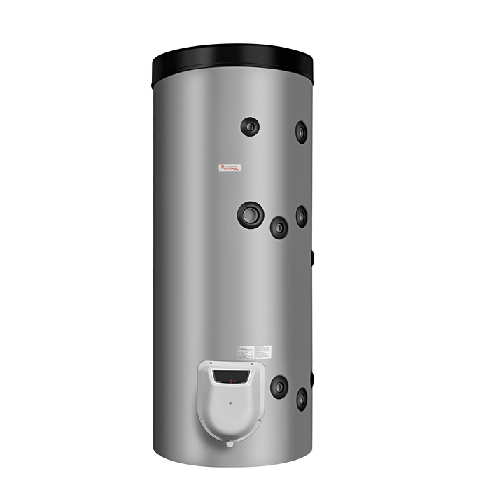 - В базовой комплектации прибор оборудован термометром, который показывает актуальную температуру внутри бойлера, гильзами для котловых датчиков, входом рециркуляции, защитным кожухом ПВХ который крепится и снимается при помощи молнии. В комплектации поставляются предохранительный клапан и заглушки для отверстий.