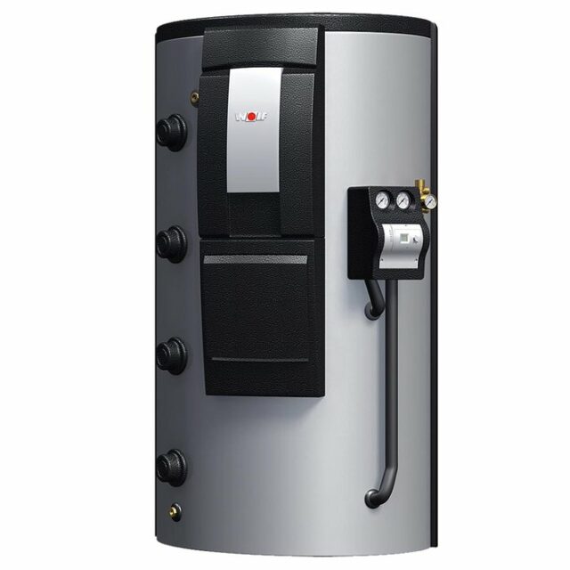 - Возможность крепления гидравлических компонентов, напр. модуля приготовления ГВС, двух насосных групп со смесителем и насосной группы контура солнечных коллекторов как на баке, так и на стене.