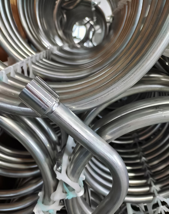Материал теплообменника: гладкая нержавеющая сталь марки SUS 316. Данный тип стали обычно используется при изготовлении сложных компонентов с предполагаемой переменной или постоянной тепловой нагрузкой — теплообменники разной степени сложности (спиралевидные, пластинчатые, реберного типа), а также стальные трубы и прочие подобные изделия.