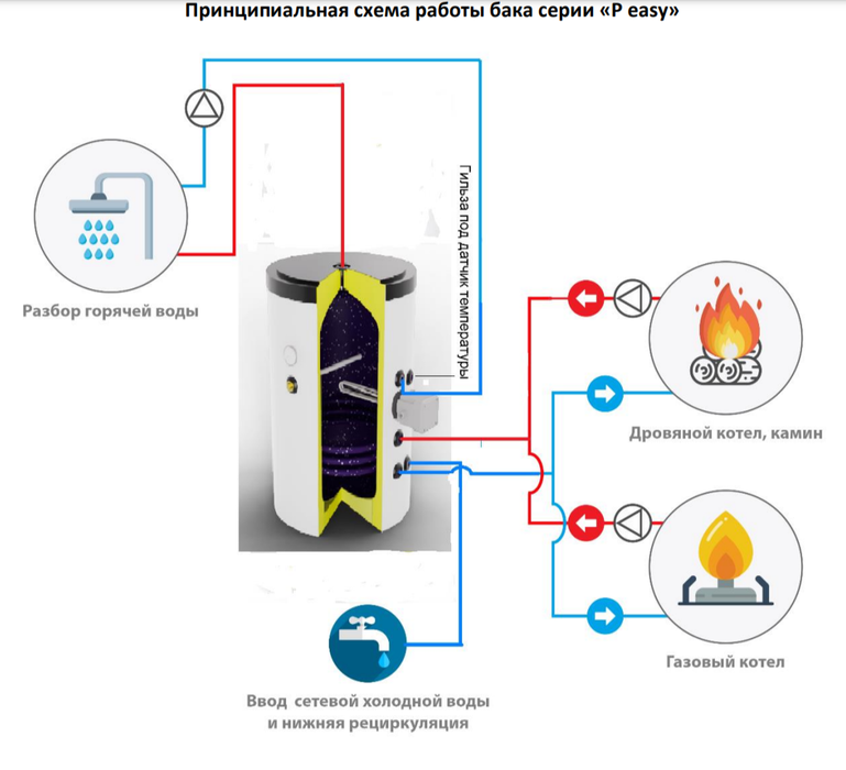 - Бак может совместно работать со следующими источниками тепла: твердотопливный котел, котел на биомассе, пеллетный котел, камин с водяной рубашкой, газовый котел, электрический котел, солнечный коллектор