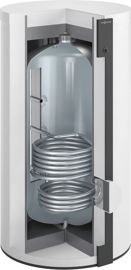 Вертикальные бойлеры Vitocell 300-V — это надежное и эффективное водогрейное оборудование от немецкого производителя Viessmann. Ассортимент изделий применяется в различных ситуациях, где требуется организовать подачу горячей воды с косвенным принципом нагрева. Подходят для бытовых и полупромышленных объектов.