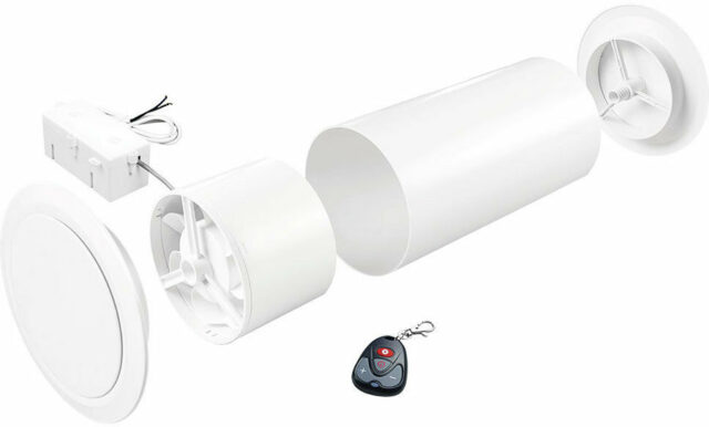 - Комплект является полностью готовым к использованию, он состоит из: 1. Вентилятор 125 мм Ø постоянного тока 24В. 2. Пульт дистанционного управления — черный, включая элемент питания CR2016. 3. Блок управления, включая соединительный кабель 230 В (1W.) и низковольтный провод для подачи питания к вентилятору (2м.). 4. Вентиляционный канал пластиковый 125 мм Ø, белый, длина 250 мм. 5. Воздушный диффузор пластиковый 125 мм Ø, белый – 2 шт.