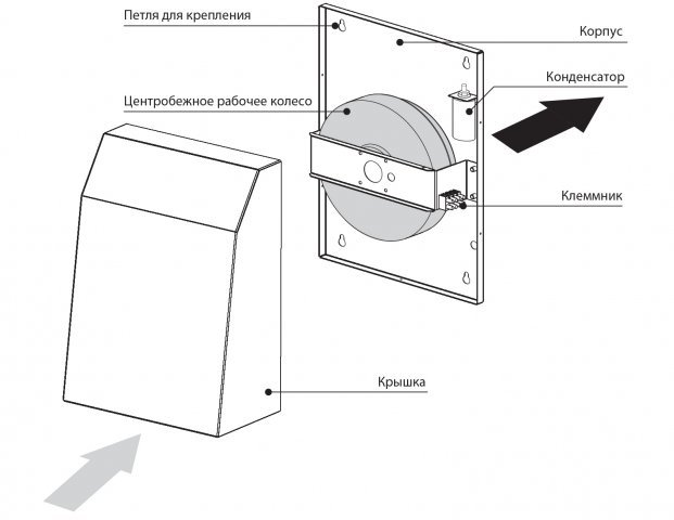- Воздух выводится вертикально вниз, через решетку с защитной сеткой от птиц и грызунов