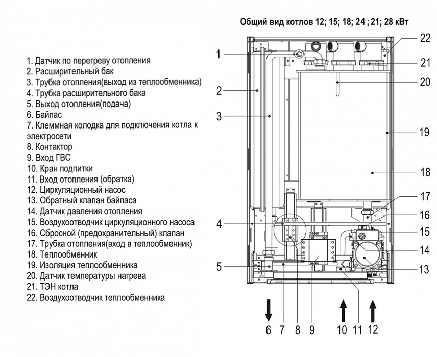 - Насос, расширительный бак и системы безопасности котла.