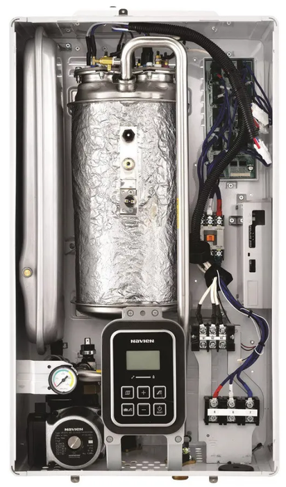 Электрический котел отопления Navien (Навьен) EQB-18HW заключен в эргономичный корпус компактных размеров. Бак сделан из нержавеющей стали, а электрический нагреватель из особого сплава Incoloy800, характеризующегося низкими теплопотерями и длительным сроком службы. Электронная панель управления и дисплей вынесены на лицевую часть корпуса.