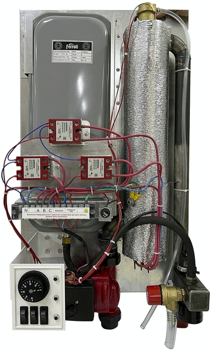- Оснащен автоматическим выключателем, обеспечивает защиту котла