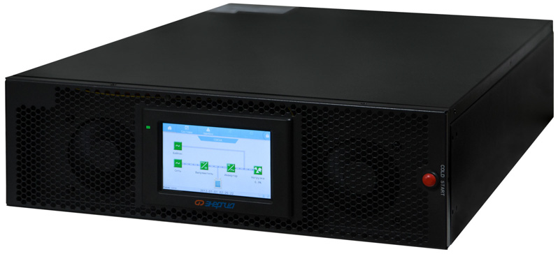 Блок бесперебойного питания Энергия Прайм-33C-10K-0-RT предназначен для работы с оборудованием мощностью до 10 кВт. Модель также выполняет функцию стабилизатора и благодаря двойному преобразованию выводит на выход напряжение в виде ровной синусоиды. На АКБ блок переключается моментально сразу после отключения света.
