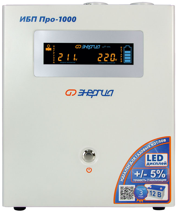 Энергия Про-1000 представляет собой блок бесперебойного питания с точностью стабилизации 5% в режиме питания от сетки и 1% в режиме инвертора. Выходной сигнал в режиме инвертора имеет форму чистой синусоиды. Для изменения автономной работы ИБП в нем можно изменить количество и емкость батарей.