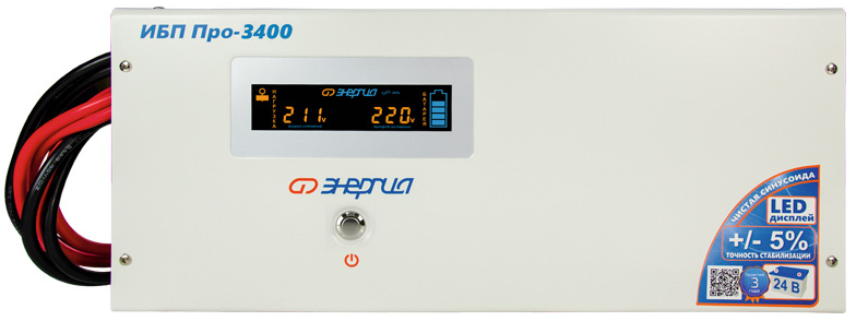 Энергия Про-3400 – это источник бесперебойного питания с воздушным конвекционным и принудительным типом охлаждения. Он не только обеспчеивает подключенную технику питанием, когда отключается свет, но также и защищает ее от скачков напряжения в остальное время использования. Класс защиты корпуса – IP20.