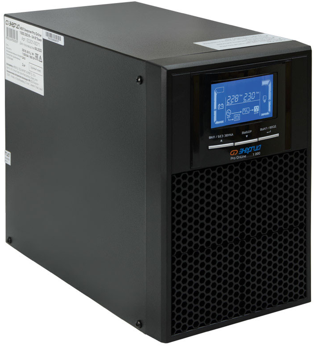 Энергия Pro Online 1000 230В-24В Tower – это эргономичный и довольно компактный блок бесперебойного питания, заключенный в металлический корпус высокой прочности. Черная расцветка делает прибор незаметным в любом интерьере. Актуальные сведения о работе ИБП отображаются на цветном дисплее, который размещен на передней панели.