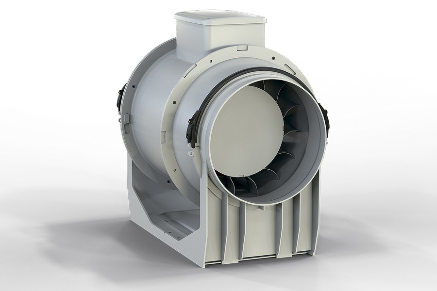 - Модель оснащена рабочим колесом смешанного типа, сочетая в себе высокую производительность осевых вентиляторов и высокое давление центробежных