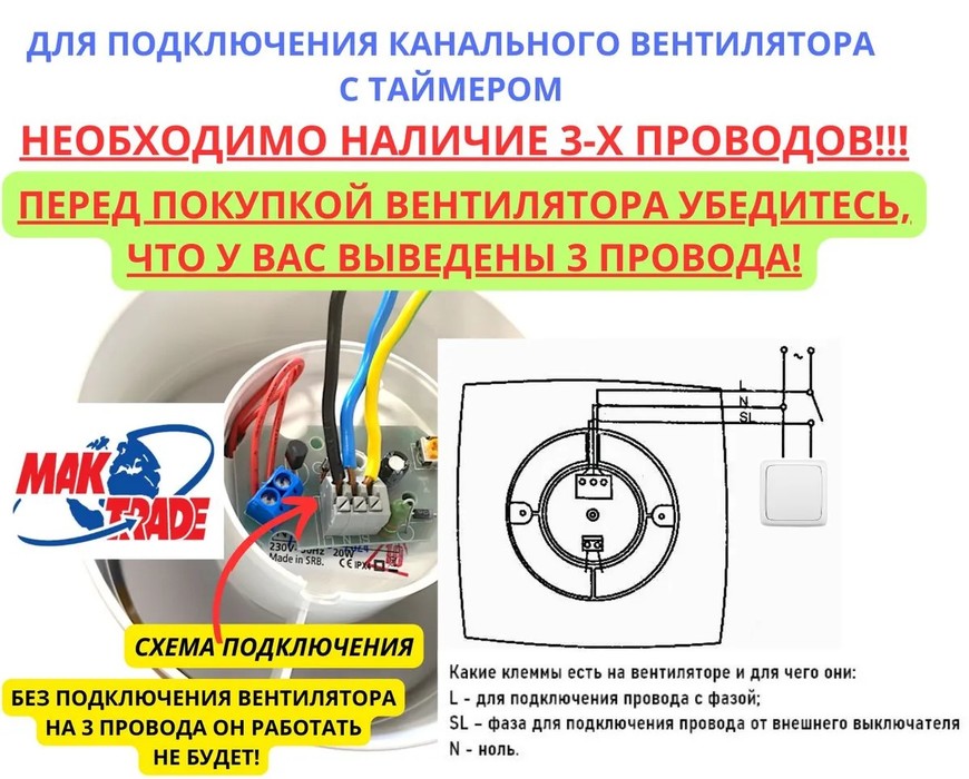 - Для подключения вентилятора с таймером требуется три провода (ноль-фаза-земля).