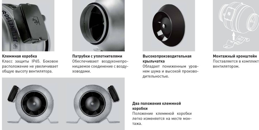 - Специальный монтажный кронштейн и боковое расположение клеммной коробки не увеличивают общую высоту вентилятора.