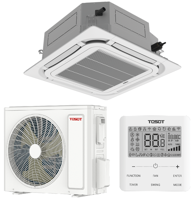 Tosot (Тосот) T60H—ILCA/I/TF06P—LC/T60H—ILUA/O – это полупромышленная кассетная сплит-система, работающая на экологичном фреоне R32. В наружный блок встроен инверторный компрессор марки Gree, Вентилятор внутреннего блока имеет три скорости вращения, также в блок встроена дренажная помпа.
