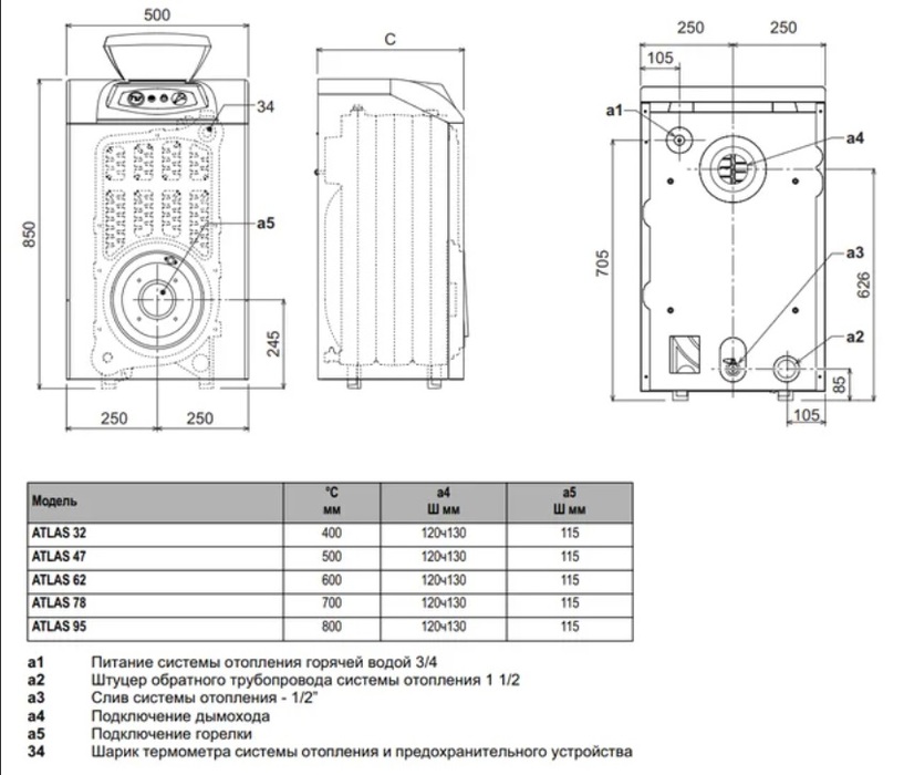Дизельный напольный котел Ferroli модель Atlas 62 данная модель котла используется совместно с наддувной горелкой на газообразном или жидком топливе. Отопительная техника предназначена для нагревания воды до температур ниже точки кипения при атмосферном давлении. В котле расположен теплообменник, который состоит из пакета чугунных секций. При изготовлении чугунных секций применяется метод профильного литья из высококачественного термопластичного чугуна, прошедших гидравлические испытания. Рациональное распределение ребер обеспечивает достаточно высокий КПД и позволяет экономить топливо. Цифровой интерфейс вместе с микропроцессором обеспечивает комфортность в эксплуатации котла. Кроме современного дизайна в представленной модели предусмотрена функция защиты от замерзания, дистанционное управление, комнатный термостат. Оборудование обязательно использовать только по назначению.
