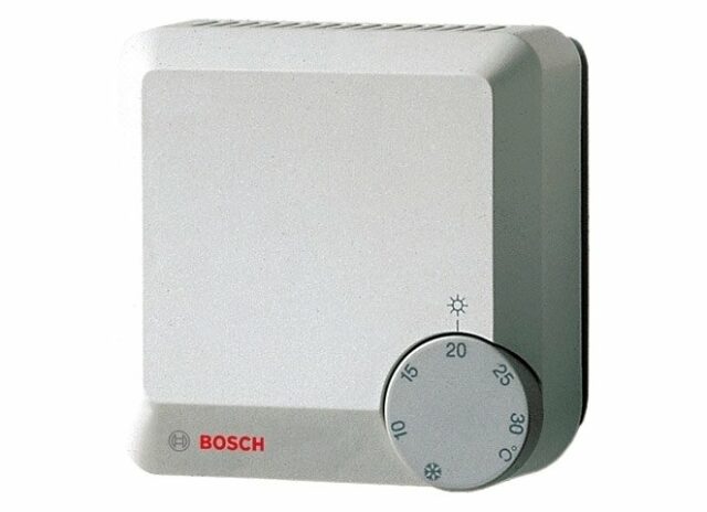 Комнатный терморегулятор TR 12 от торговой марки Bosch предназначен для работы в газовой системе отопления помещений. Прибор позволит регулировать пламя горелки по двум позициям и управлять циркуляционным насосом. Регулятор оборудован простой поворотной ручкой. Диапазон температуры достаточно широк – от +5 до +30Сº. Стоит отметить, что установку данной модели должен производить исключительно подготовленный специалист.