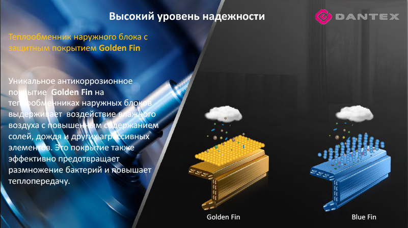 - Теплообменник наружного блока с защитным покрытием Golden Fin.