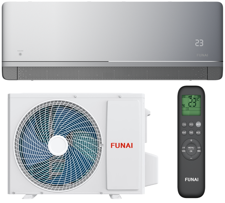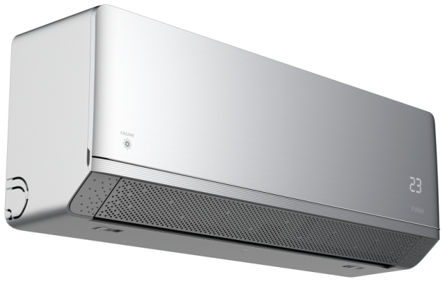 Funai (Фунаи) Kagami RACKM20HP.D01 – это бытовой настенный кондиционер с изящной цветовой стилизацией внутреннего блока и надежной конструкцией наружного (шумоизоляция, защитные накладки на вентилях, виброоопоры). Наружный блок оборудован компрессором постоянной производительности GMCC, а хладагентом в нем является фреон R410A.