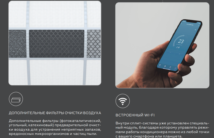 - Универсальная установка — подключение коммуникаций внутреннего блока слева или справа в зависимости от архитектуры пространства.
