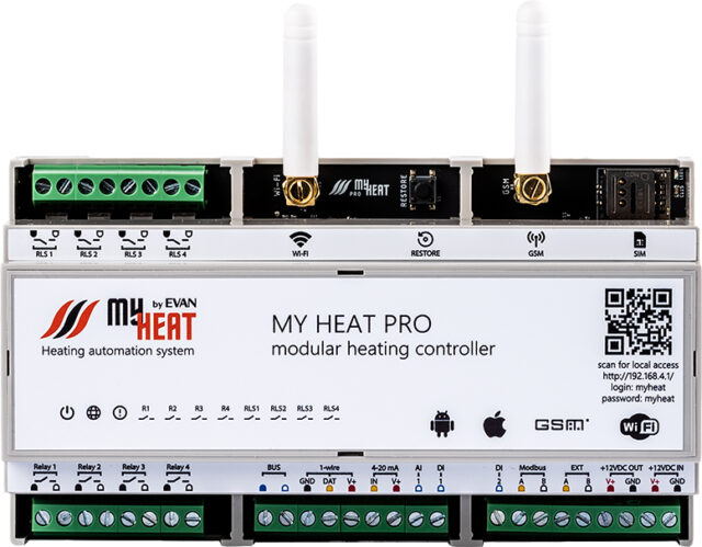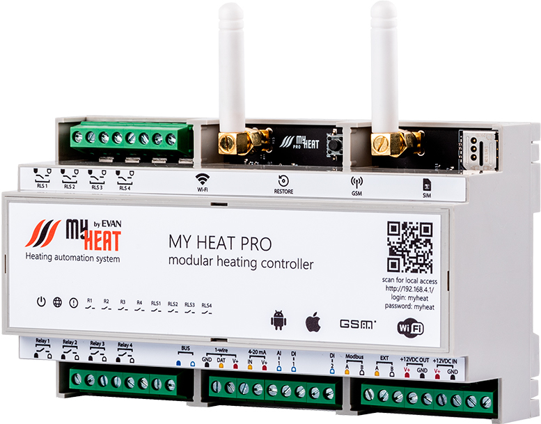 Контроллер MY HEAT (Майхит) PRO осуществляет управление сложными системами отопления и горячего водоснабжения в частных домовладениях и небольших предприятиях. Управление каскадом котлов, бойлером косвенного нагрева, насосами, смесительными узлами, 3-х и 2-х ходовыми клапанами – основное предназначение устройства и предоставляет возможность регулировать температурный режим до 80 сред отопления включительно.