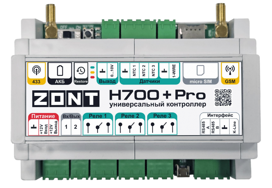 Контроллер универсальный Zont (Зонт) H700+ PRO для профессионального применения по контролю и управлению системами отопления. Функционирует с котлами, бойлером горячего водоснабжения, циркуляционными насосами и любыми электроприборами. По заранее запрограммированному алгоритму управляется автоматически, а также вручную с мобильного приложения либо в личном кабинете.