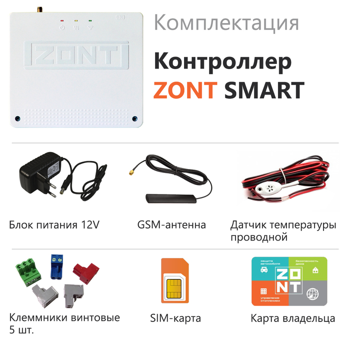 ZONT (Зонт) SMART (ML00004159) — современный и функциональный контроллер, позволяющий управлять работой систем отопления и горячего водоснабжения. Прибор автоматически регулирует действие котла благодаря информации, полученной с температурного датчика. Компактное устройство легко крепится на любую поверхность.