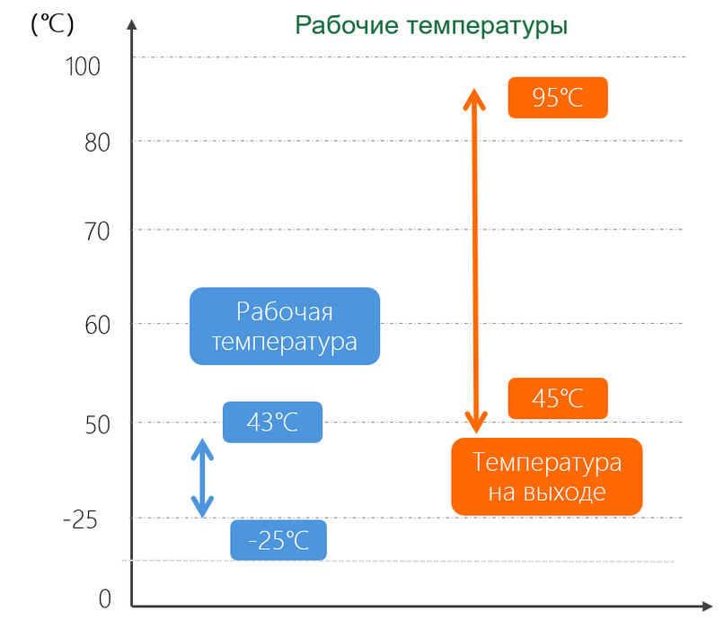- Работает эффективно даже при низких температурах окружающей среды, минимальные условия работы -25°C