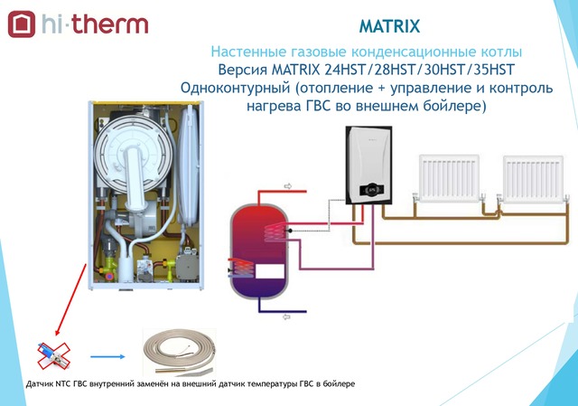 Котлы конденсационные газовые, представленные итальянской Hi-Therm в серии Matrix могут эффективно и безопасно функционировать на природном и на сжиженном газе и предназначены для отопления с учётом подготовки необходимого количества горячей воды. Пластиковая оптическая панель управления и ЖК-дисплей моделей делают обслуживание удобным и простым. В серии представлены модели с двумя контурами, а также одноконтурные с управлением нагрева ГВС в отдельном бойлере и без возможности управления нагрева воды.