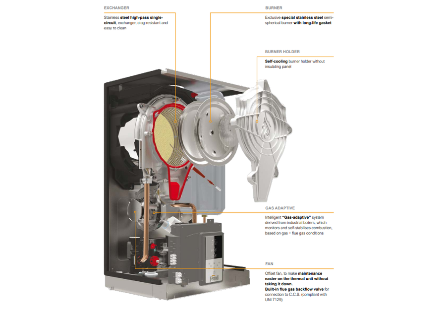 - MC2: «Multi Combustion Control» – многоуровневое регулирование процесса горения: газоадаптивная технология обеспечивает контроль процесса горения в широком диапазоне модуляции мощности;