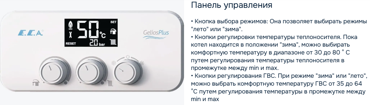 Газовые котлы GELIOS PLUS, производимые известной турецкой компанией ECA, представляют собой элегантные, компактные и чрезвычайно надежные устройства, предназначенные для отопления и обеспечения горячей водой частных и загородных домов. Модели собраны из качественных европейских компонентов и выделяются своей компактной конструкцией, экономичностью и сниженным уровнем выбросов CO2.