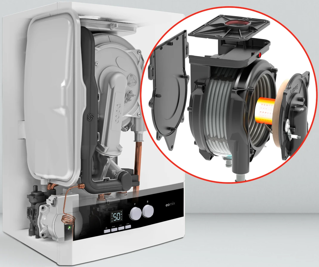 Универсальный котел COPA (КОПА) EOMIX 35 кВт комбинированный выполнен в настенной конструкции, которая работает на магистральном топливе. Компактный корпус и минимальный уровень шума улучшают эксплуатационные параметры оборудования. Передняя сторона оснащена удобной панелью управления с дисплеем, который отображает основную информацию о работе.