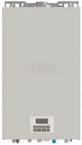 VilTerm (Вилтерм) Comfort 14 ТC – это двухконтурный газовый котел с настенным типом установки. На переднюю панель вынесен небольшой дисплей и клавиши управления устройством. Интуитивно понятный интерфейс позволяет быстро отрегулировать температуру отопления и ГВС, или же выставить другие настройки.
