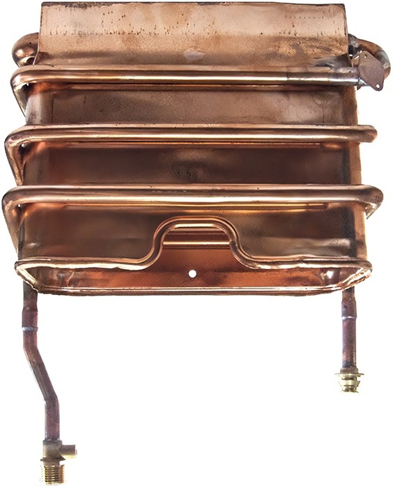 Ariston (Аристон) Основной теплообменник (65152654) изготовлен из меди, которая устойчива к высоким температурам и коррозии. Он используется в газовых колонках с целью нагрева воды в контурах отопления, передавая тепло от сгораемого газа к рабочей жидкости, проходящей через теплообменник.