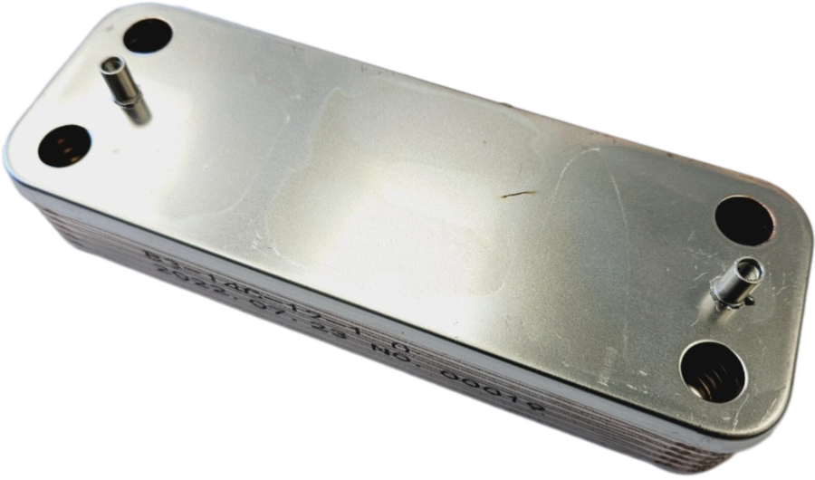 Fondital (Фондиталь) Пластинчатый теплообменник (6SCAMPIA07) состоит из 12 гофрированных пластин, сделанных из нержавеющей стали и соединенных между собой. Корпус изделия изготовлен из меди. Это вторичный теплообменник, который устанавливается в двухконтурные котлы и необходим для нагрева воды контура ГВС.