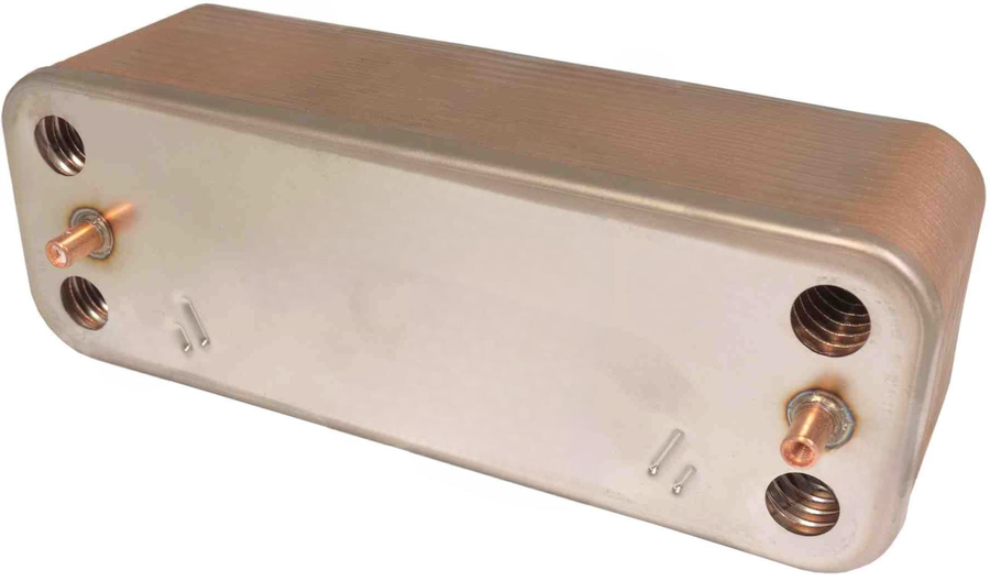 Fondital (Фондиталь) Пластинчатый теплообменник (6SCAMPIA09) устанавливается в газовые котлы с целью нагрева воды в системе горячего водоснабжения. Это вторичный теплообменник, который состоит из 26 пластин, изготовленных из нержавеющей стали и соединенных между собой. Корпус сделан из меди.