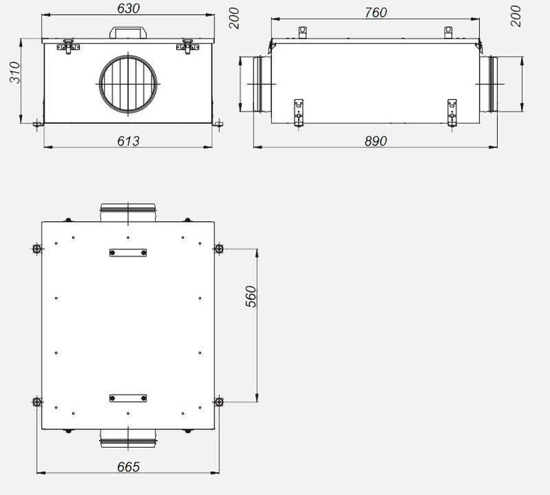 - Для подсоединения к системе воздуховодов имеются два выхода диаметром 200 мм.