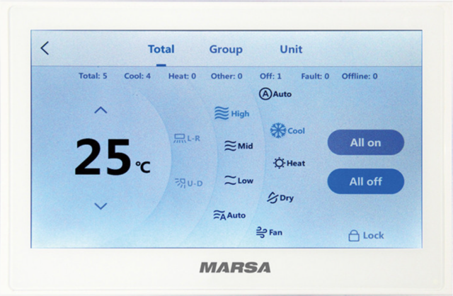 Marsa (Марса) CCM-HA представляет собой пульт центрального управления, предназначенный для сплит-систем. Он крепится на стену и позволяет осуществлять контроль и управление настройками, функциями, температурными режимами с помощью сенсорного дисплея и кнопок. На экране отображаются все необходимые данные: температура, выбранный режим, время и пр.