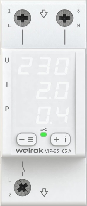 Многофункциональное реле напряжения Welrok (Велрок) VIP-63 имеет компактные габариты, три белых индикатора, два модуля. Устанавливается на DIN-рейку. Имеет класс защиты IP20, потому при монтаже во влажном помещении устройство рекомендуется помещать в оболочку, имеющую степень защиты не менее IP55.