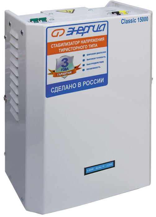 Энергия 15000 ВА серии Classic – это стабилизатор напряжения из категории тиристорных. Он отличается от прочих аналогов высокой степенью стабилизации, низкими шумами, отличной устойчивостью к вибрациям, высоким и низким температурам, а также влажности. Еще одним преимуществом модели является универсальный монтаж.