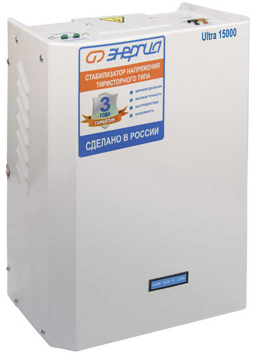 Стабилизаторы напряжения серии Ultra российского производителя Энергия являются идеальным сочетанием функциональности, надежности и долговечности. Тиристорные модели имеют почти что неограниченный ресурс и потому будут надежно работать много лет. В данную серию входит 7 моделей с мощностью от 500 до 35000 ВА.