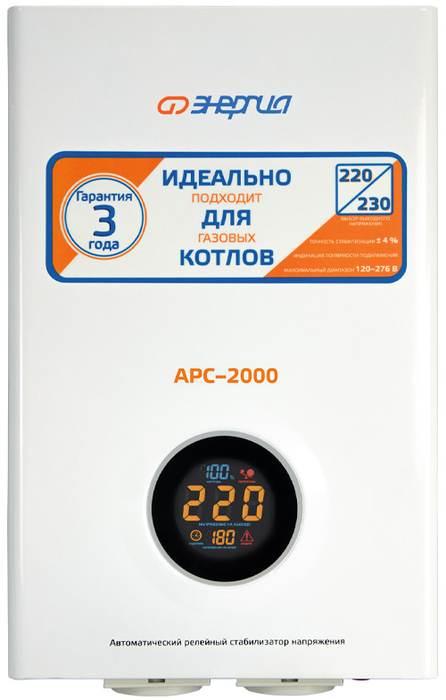 Энергия АРС-2000 – это стабилизатор напряжения с однофазным подключением. Модель подходит для бытового использования в российских однофазных электрических сетях. Корпус стабилизатора сделан из качественного и износостойкого металла. Подключаемого оборудование предохраняется от скачков напряжения, короткого замыкания, перегрузок.