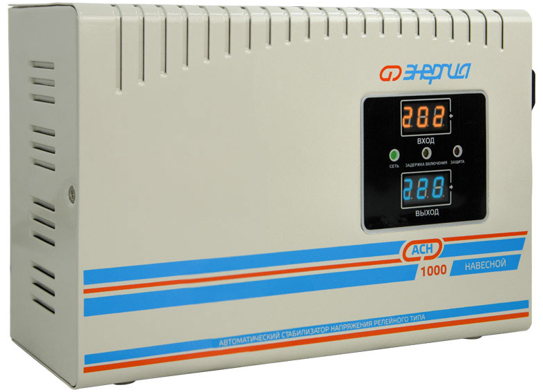 Стабилизатор напряжения Энергия АСН-1000 навесной относится к категории релейных однофазных устройств и подходит для непрерывного использования. Он защищает подключенное оборудование (например, отопительные котлы) от перегрузок и резких скачков напряжения. Корпус стабилизатора сделан из металла.