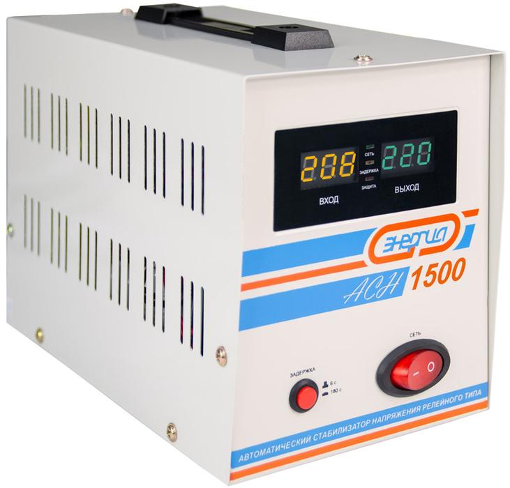 Энергия АСН-1500 с цифр. дисплеем – это бытовой стабилизатор напряжения из категории однофазных. Его корпус выполнен из металла и окрашен в белый цвет. Для удобства переноски оборудование снабжено транспортировочной ручкой в верхней частик корпуса. Повышенная морозостойкость дает стабилизатору возможность работать при температуре до -20 градусов.