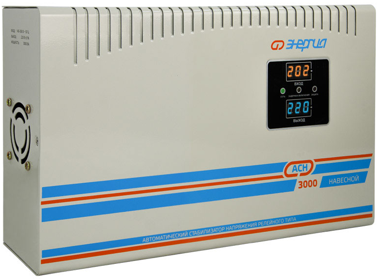 Энергия АСН-3000 навесной – это стабилизатор напряжения однофазного типа. Он относится к категории релейных устройств и может использоваться в непрерывном режиме. Допускаемая длительная перегрузка прибора составляет не более 110%. Есть функция принудительного охлаждения корпуса в случае его перегрева.