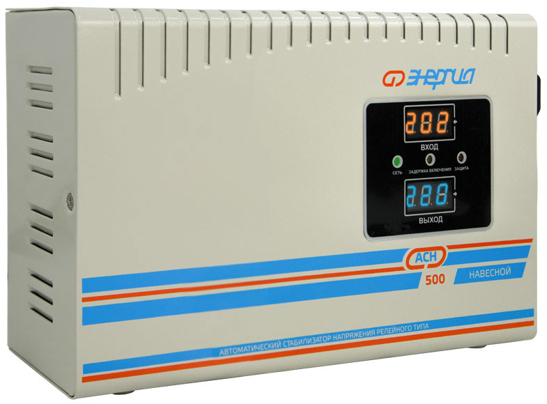 Энергия АСН-500 навесной – это стабилизатор напряжения, выполненный в тонком металлическом корпусе с классом защиты IP20. Производителем допускается эксплуатация прибора при температуре воздуха в комнате от -20 до +40 градусов. Спереди на корпусе расположен цифровой LED-дисплей, на котором отображаются данные о входном/выходном напряжении.
