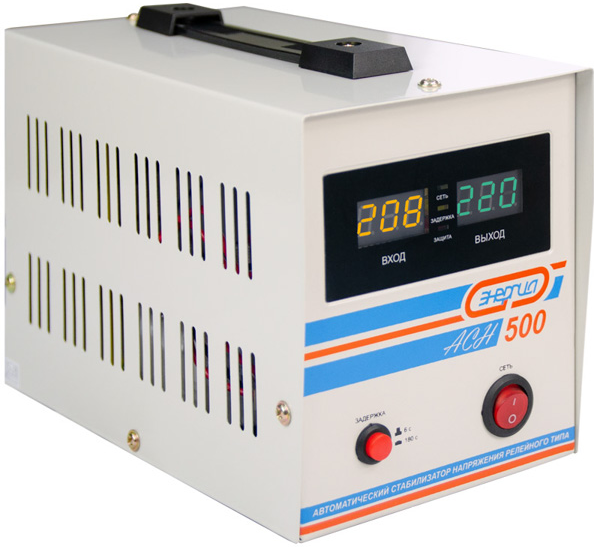 Энергия АСН-500 с цифр. дисплеем – это стабилизатор напряжения, выполненный в компактном металлическом корпусе с транспортировочной ручкой сверху. Модель можно поставить на пол, стол, подоконник или в другое удобное для пользователя место. Стабилизатор поддерживает систему поглощения электрической дуги и функцию интеллектуальной защиты от перегрузок.