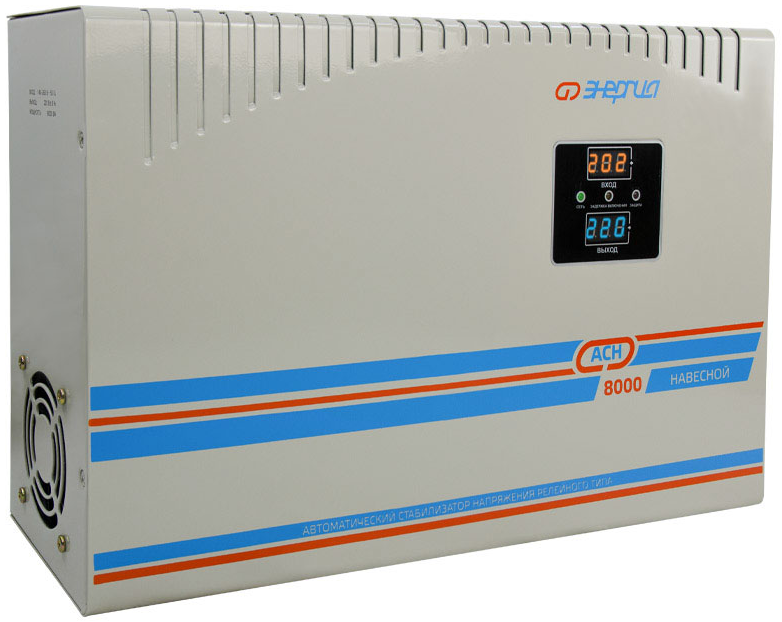 Однофазный бытовой стабилизатор напряжения Энергия АСН-8000 навесной выполнены в компактном и достаточно тонком металлическом корпусе и оснащен дисплеем на передней панели. Оборудование через электрическую вилку подключается к нему сбоку. Крепления для монтажа входят в комплект поставки.
