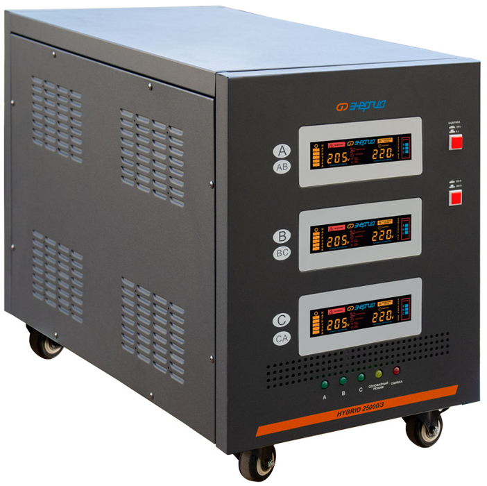 Гибридный стабилизатор напряжения Энергия Hybrid-30000/3 совмещает в себе функции релейного прибора и электромеханического. Он работает плавно, точно, эффективно и с небольшими шумами. Для перемещения прибора с одного помещения в другое в нем предусмотрена колесная база. В трансформатор встроен термодатчик.