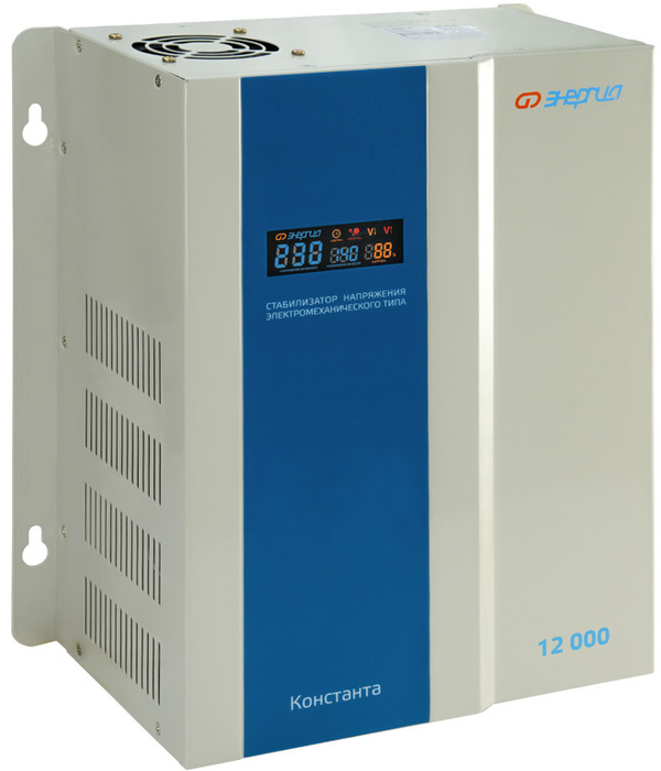 Электромеханический стабилизатор напряжения Энергия Константа 12000 можно установить на пол или подвесить на стену. Он подойдет для непрерывного использования и защитит подключенную технику от скачков напряжения, перегрузок, короткого замыкания. Сама по себе модель защищена еще и от перегрева.